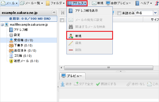 上部メニューの『アドレス 』をクリックし、『新規 』を選択します。