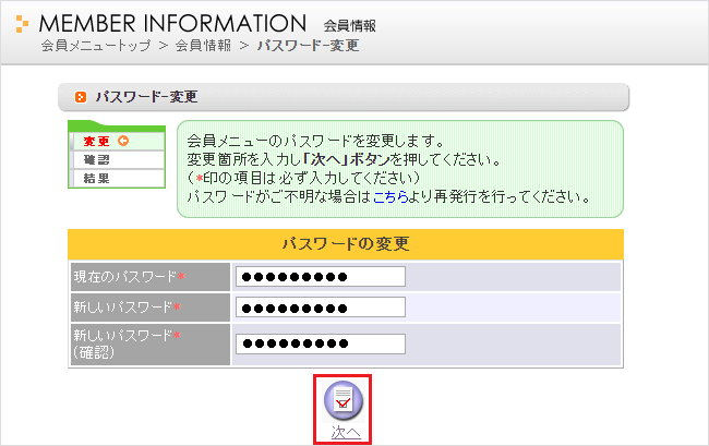 会員メニューパスワードの『変更・再発行』について案内を行っています。