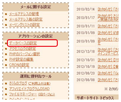 サーバコントロールパネルにログインし、「データベースの設定」をクリックします。