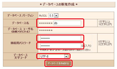 「データベース名」「接続用パスワード」を入力後、「UTF-8」を選択し、「データベースを作成する」をクリックします。