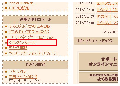 サーバコントロールパネルのトップページを表示します。「クイックインストール」をクリックします。