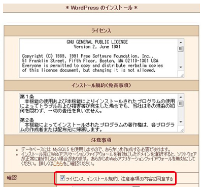 「ライセンス」「インストール規約(免責事項)」「注意事項」を確認し、「確認」をチェックします。