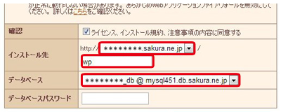 「インストール先」のドメインを選択後、WordPressのインストール先フォルダ名を入力し、「データベース」を選択します。