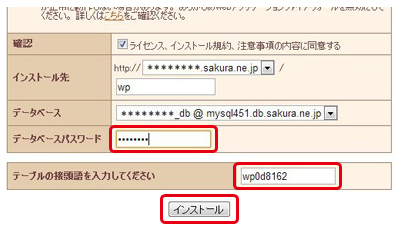 「データベースパスワード」を入力後、「接頭語」を設定し、「インストール」をクリックします。