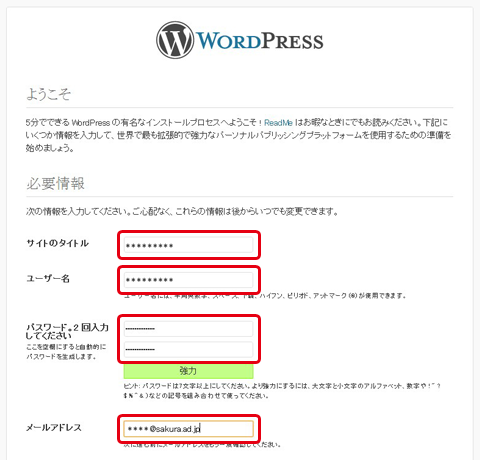 「サイトのタイトル」を入力後、「ユーザ名」と「パスワード」を設定し「メールアドレス」を入力します。
