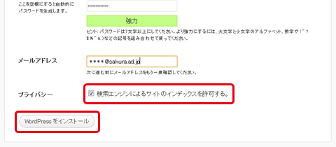 「プライバシー」をチェックし、「WordPressをインストール」をクリックします。