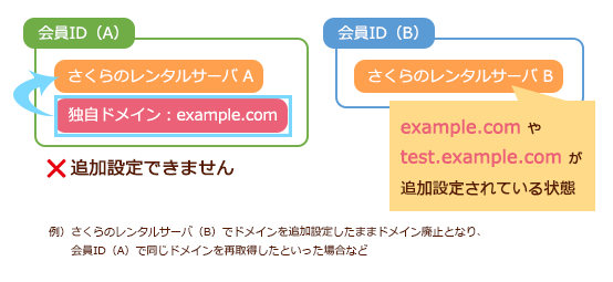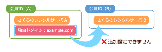 会員ID (B): 会員ID (A) で契約中の独自ドメイン [ example.com ] を、さくらのレンタルサーバ [B] に追加設定して利用することはできません。