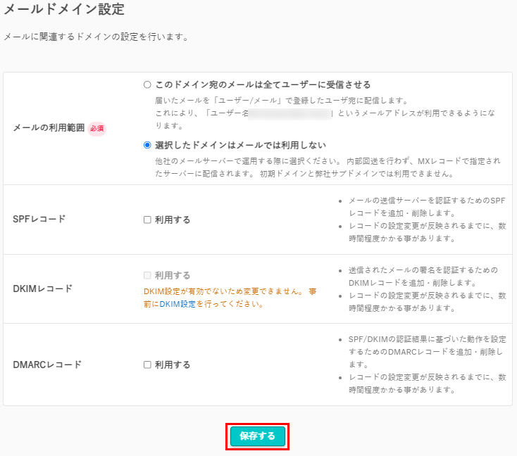 5「メールの利用範囲」の『選択したドメインはメールでは利用しない』にチェックをいれます。