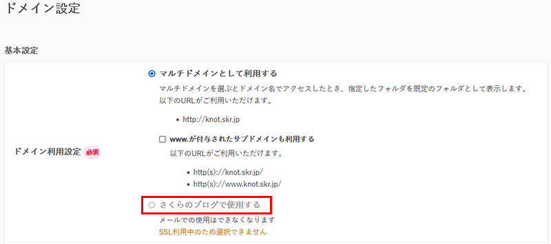 5「ドメイン利用設定」の『さくらのブログで使用する』にチェックをいれ、独自ドメインを設定するブログを選択します。
