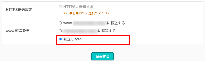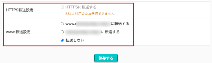 3[HTTPS転送設定][www.転送設定]の欄をご確認ください。ご希望の設定を選択後、『保存する』をクリックすると、設定が完了します。