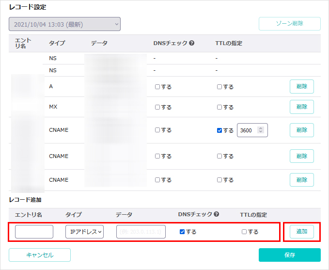 エントリ名「@」値に「NSレコード」を入力し新規登録された場合、個別削除ができず一度設定の全削除をしていただき、改めて個別の設定を登録していただく必要がございますので、決して登録されないようお気をつけください。