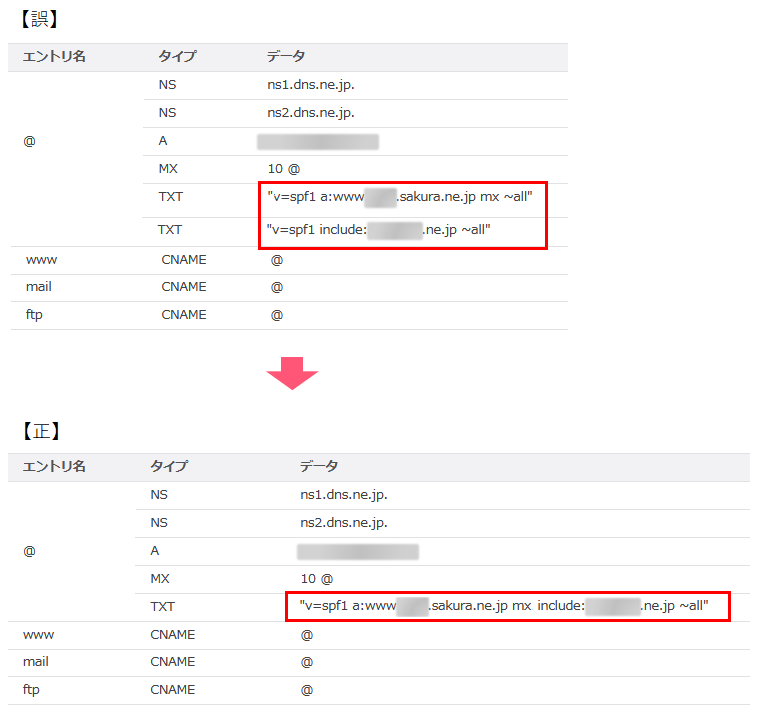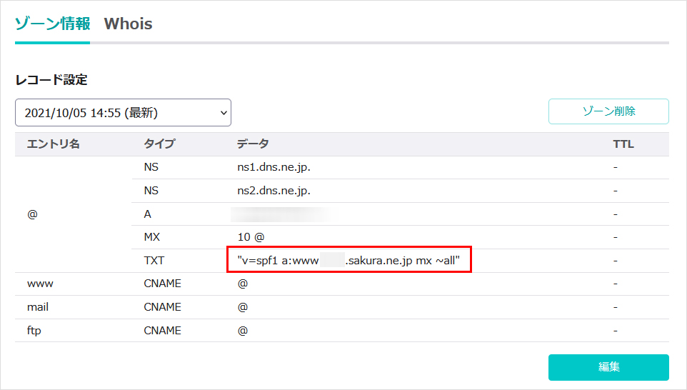 a:www***.sakura.ne.jp www***.sakura.ne.jp の A レコードを SPF レコードに指定します。