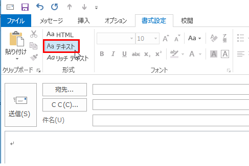 メールの作成画面において、「書式設定」タブを開き、「テキスト」をクリックします。