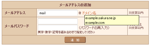 - ドメイン名のところにカーソルを置いたときに表示されるドメイン名全てで、作成したメールアドレスが利用できます。※1