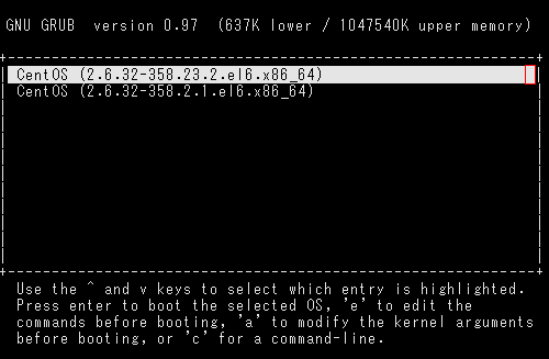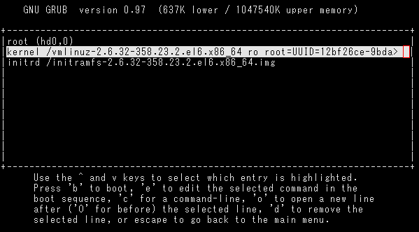 『 kernel /vmlinuz-2.*.**-***.**.*.***.***_** ro root=****=********-****> 』にカーソルを合わせて、