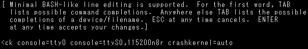 『 console=tty0 console=ttyS0,115200n8r crashkernel=auto 』の文字をバックスペースキーで削除し、