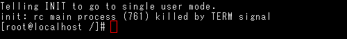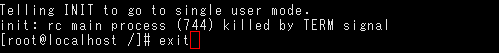 「exit」と入力して「Enter」キーを押すことで、シングルユーザモードが終了します。