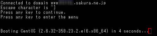『 Booting CentOS (2.6.**-***.**.*.***) in * seconds .... 』が表示されたら、キーボードの「Enter」キーを押します。