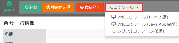 「コンソール」から「VNCコンソール」をクリックします。