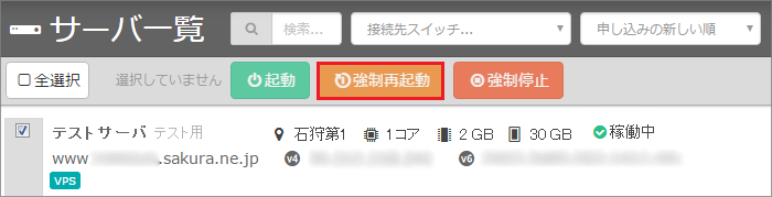 サーバ選択後「 強制再起動 」をクリックします。