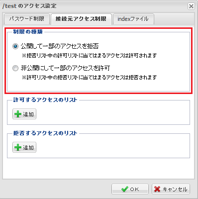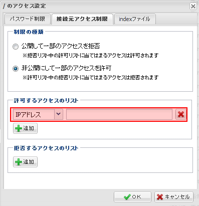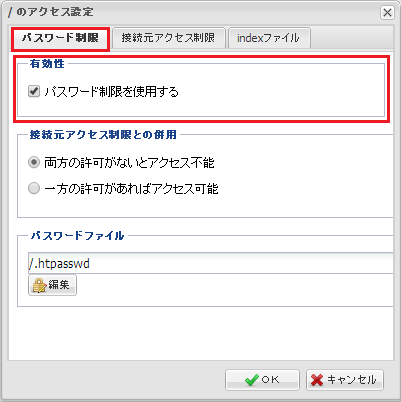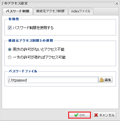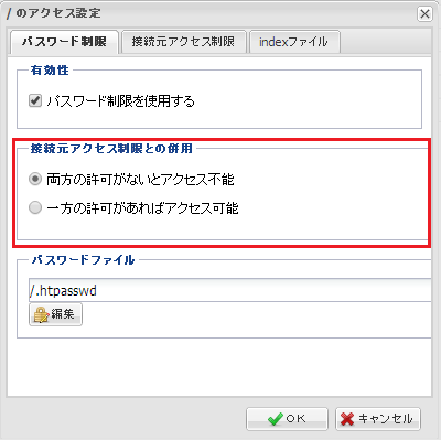 『 パスワード制限 』『 接続元アクセス制限 』のいずれか一方のタブに設定された 条件を満たせば、アクセスが許可されるようになります。 |