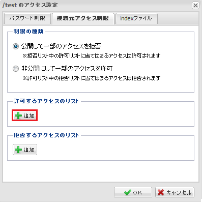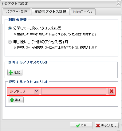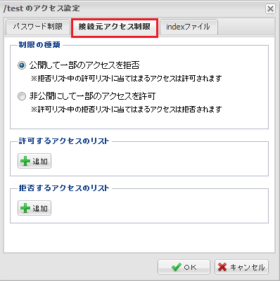 接続ホストやIPアドレスで制限をかけます。設定を行った下層フォルダに適用されます。