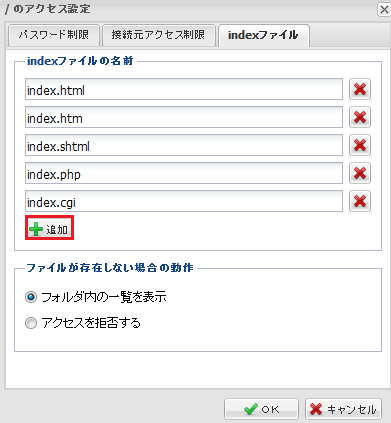 『 indexファイルの名前 』項目で、『 追加 』ボタンをクリックします。
