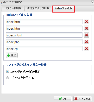 アクセス設定画面が表示されます。『 indexファイル 』タブをクリックします。