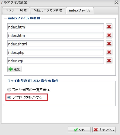 「 index.html( index.htm ) 」が存在しない場合、ファイル一覧を表示しない設定にする