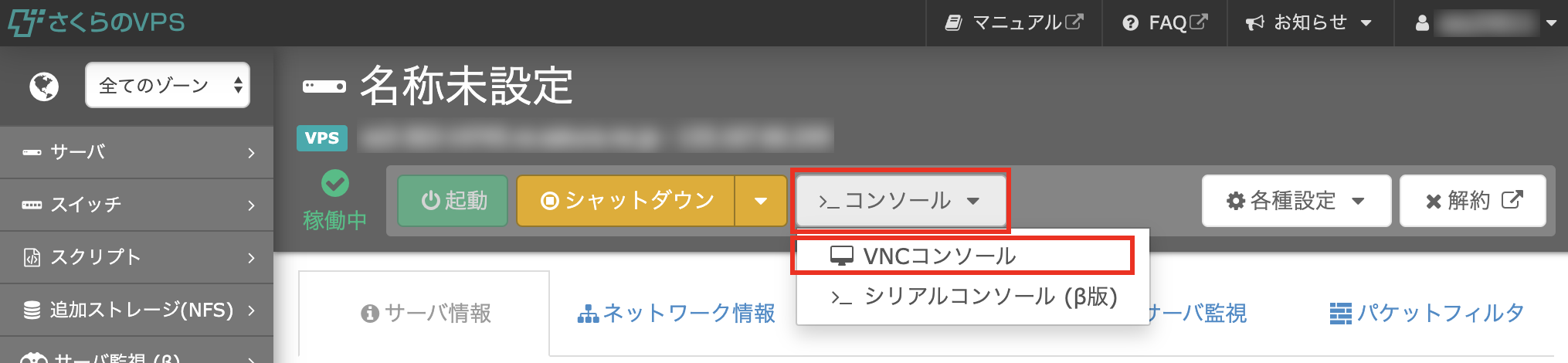 サーバを選択し、「コンソール」から「VNCコンソール」をクリックします。