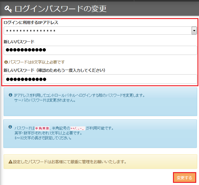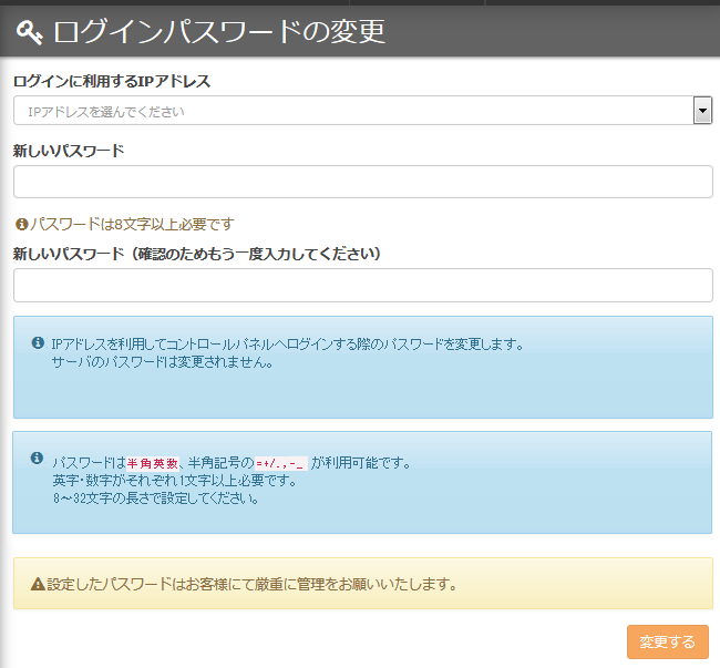 『ログインに利用するIPアドレス』をプルダウンから選択し、『新しいパスワード』を2回入力し、『変更する』ボタンを押します。