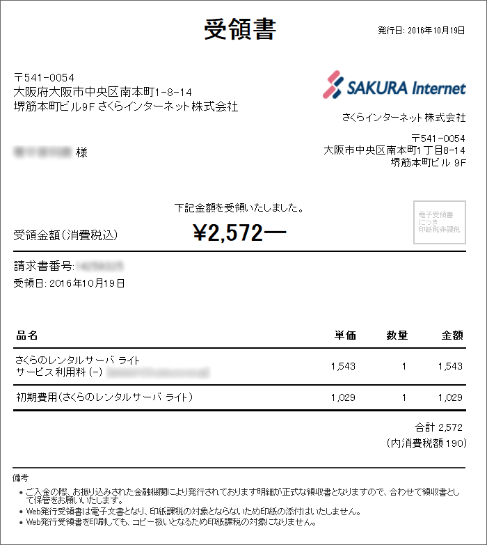 - 「さくらのクラウド」は、受領書発行に対応しておりません。