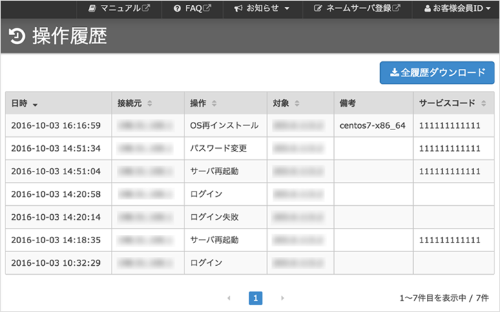 「操作履歴」ページにて「全履歴ダウンロード」ボタンをクリックすることで、