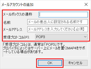 2「 メールアカウントの追加 」画面で、以下の項目を入力し『 OK 』をクリックします。