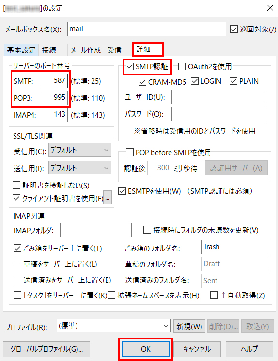 「 メールボックスの設定 」画面で『 基本設定 』タブ、『 詳細 』タブ内の項目を変更し、『 OK 』をクリックします。