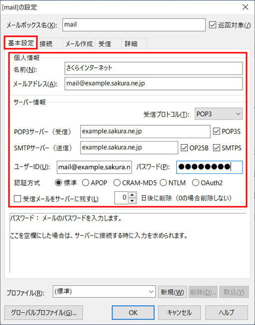 3「 メールボックスの設定 」画面で『 基本設定 』タブを選択し、以下の項目を入力します。