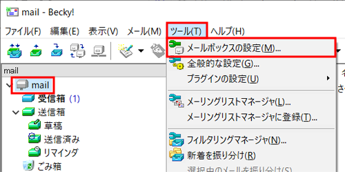 変更したいメールアカウントを選択し、『 ツール 』から『 メールボックスの設定 』をクリックします。