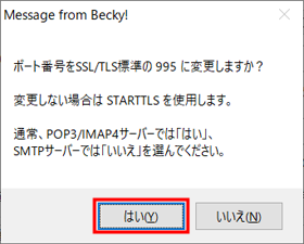 「POP3S」にチェックを入れると、以下のようなメッセージが表示されます。『 はい 』をクリックします。