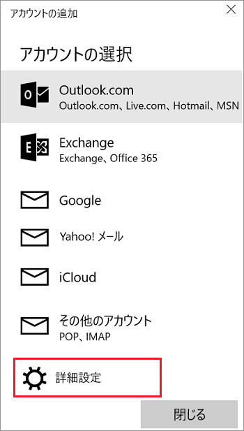 2「 アカウントの追加 」の画面で『 詳細設定 』をクリックします。