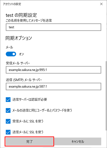 9送信(SMTP)メールサーバー欄を「初期ドメイン:587:1」になるように修正して『 完了 』をクリックします。