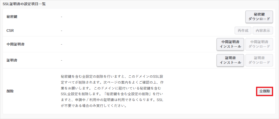 - 『SSL設定の全削除』を行うと秘密鍵を含む全ての設定ファイルが削除され、httpsでのアクセスができなくなります。