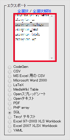 3「エクスポート」の欄に作成済みのデータベースの一覧項目が表示されます。