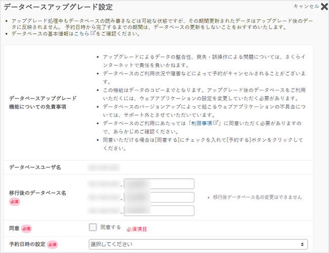 また、移行先のデータベースに、すでに同名のデータベースがあると予約することができません。