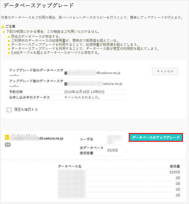 ※上記の場合、通常であれば不要なデータベース1個を削除することで本来はアップグレードできますが、MySQL5.1を複数利用されている場合のみ、MySQL5.1で利用中のデータベース分の個数の空きが必要です。