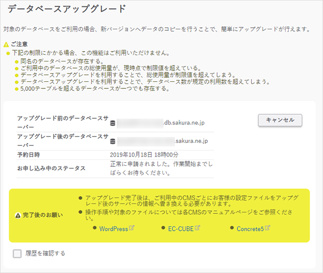 ECサイトなど、データベースが頻繁に更新されるようなウェブサイトを公開されているお客様は、設定変更が完了するまでの間、事前にウェブサイトの更新を止める事を推奨いたします。