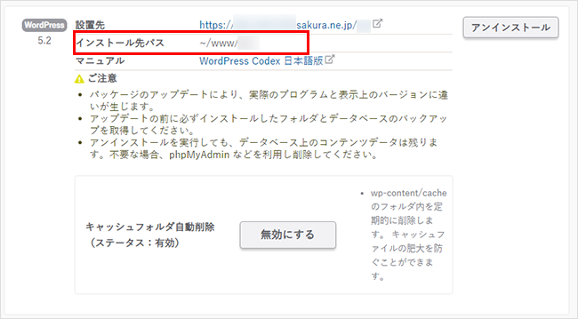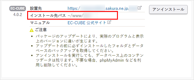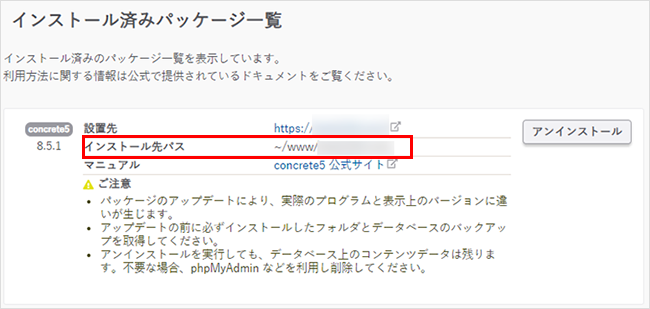 2インストール済みパッケージ一覧から、concrete5の「インストール先パス」を控えて下さい。