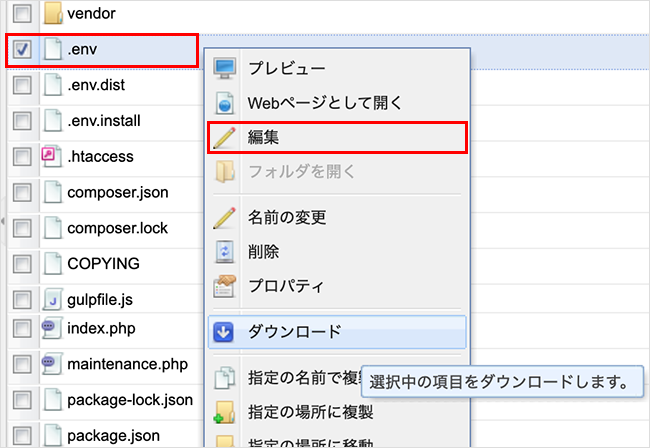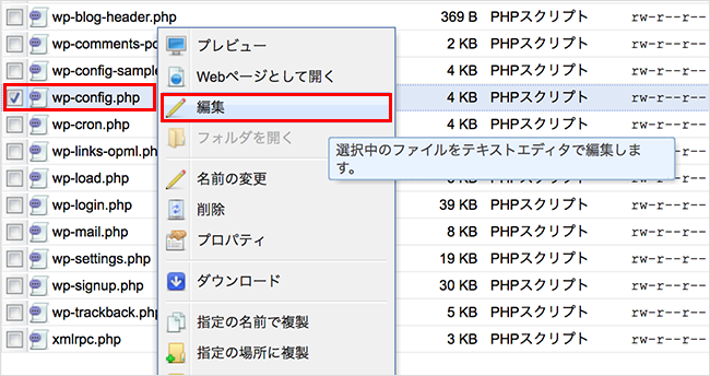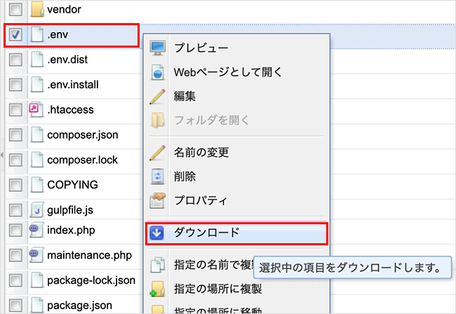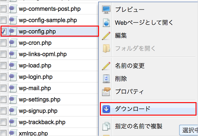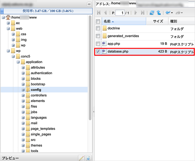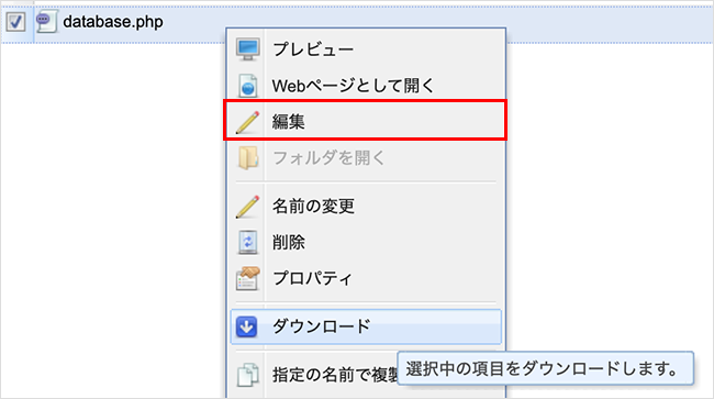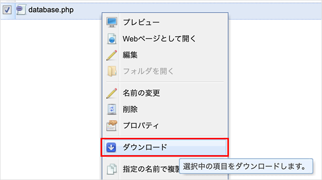 3設定ファイルを誤って削除してしまった時などの為に、切り戻しができるようデータベース情報が記述されている「database.php」を編集を行う前にお手元のパソコンにダウンロードします。
