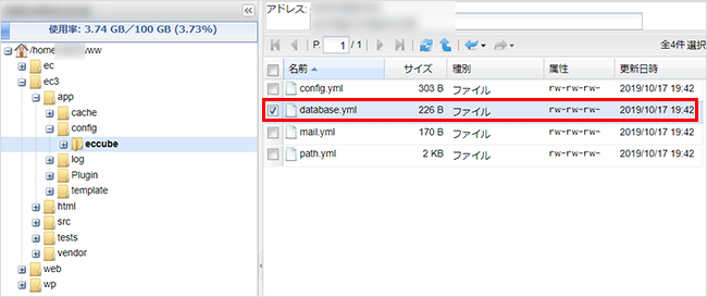 データベース情報が記述された設定ファイルは「app」 →「config」→「eccube」にある「database.yml」というファイルです。
