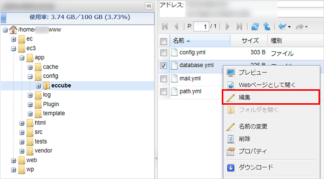 3設定ファイルを誤って削除してしまった時などの為に、切り戻しができるようデータベース情報が記述されている「database.yml」を編集を行う前にお手元のパソコンにダウンロードします。