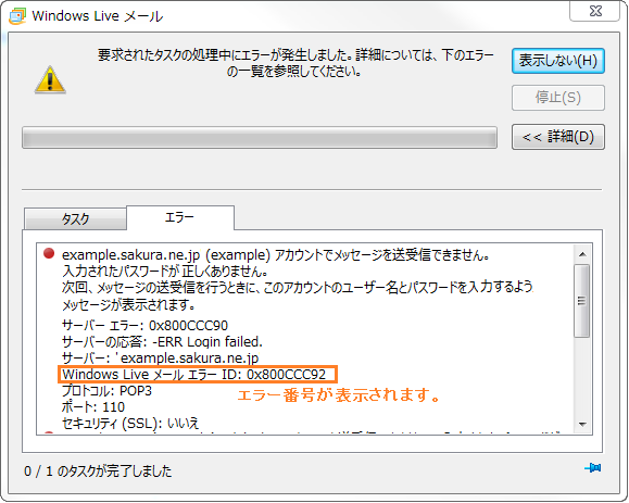 エラー番号は、Windows Live メールエラーIDの欄に表示されています。